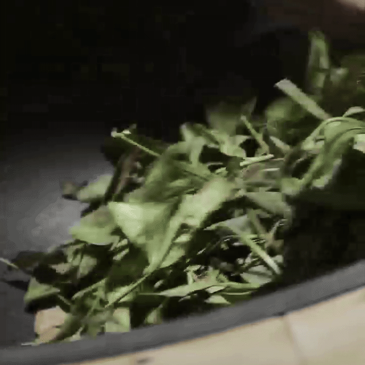 Leaves are lightly shaken, bruising the edges to spark natural oxidation.